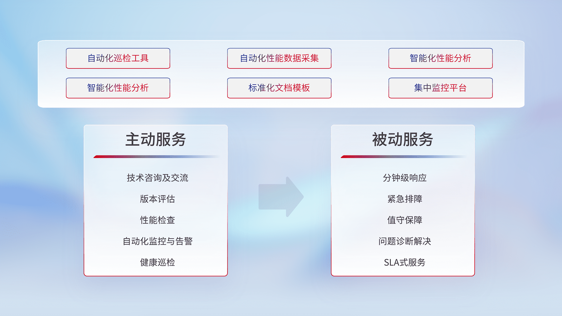 智能化工具和标准化文档,,,,保障服务质量,,,,提供主动服务(包含技术咨询、、、版本评估、、、、性能检查、、自动化监控与告警、、、、健康巡检)和被动服务包含(分钟级响应、、、紧急排障、、值守保障、、、问题诊断解决、、SLA服务)。。。。